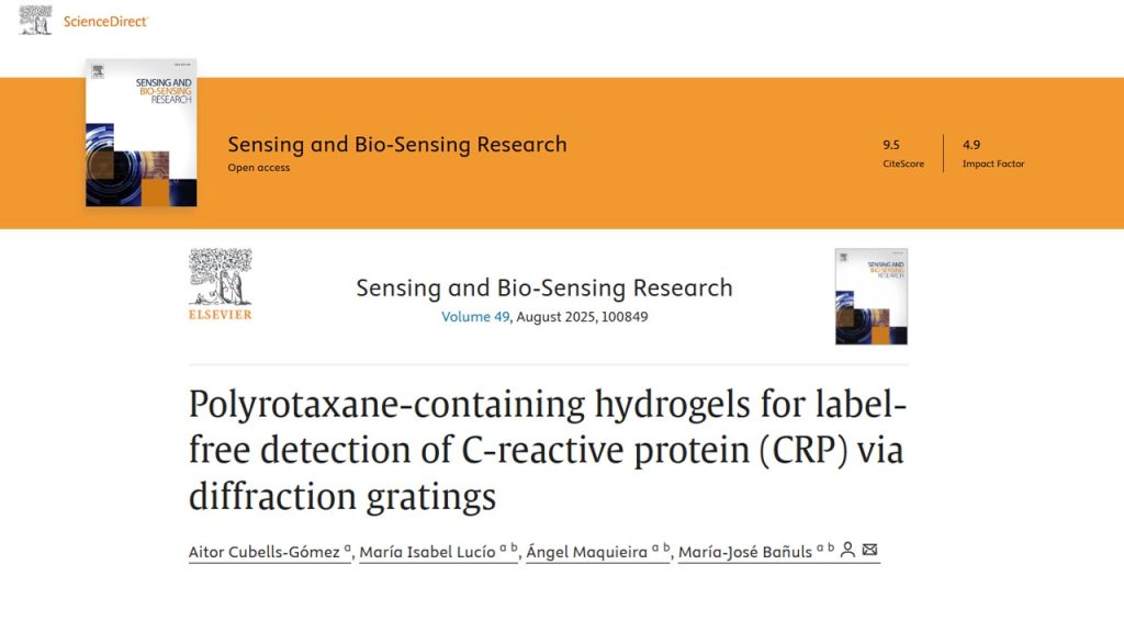 Primera publicación derivada de HARMONIA Hemos publicado el primer artículo resultado de los avances realizados en HARMONIA. En este trabajo, hemos desarrollado hidrogeles biofuncionales que integran estructuras supramoleculares de anillos deslizantes. Estos materiales ofrecen mejor selectividad y sensibilidad en la detección de biomoléculas, como el albúmina de suero bovino y anticuerpos IgG de conejo, sin necesidad de etiquetas. Los hidrogeles presentan características mecánicas superiores, con una durabilidad y elasticidad comparables a la piel humana. Además, su flexibilidad permite adaptar los elementos de reconocimiento a diversas aplicaciones. Os invitamos a leer el artículo completo para conocer más sobre estos avances en biosensado holográfico.